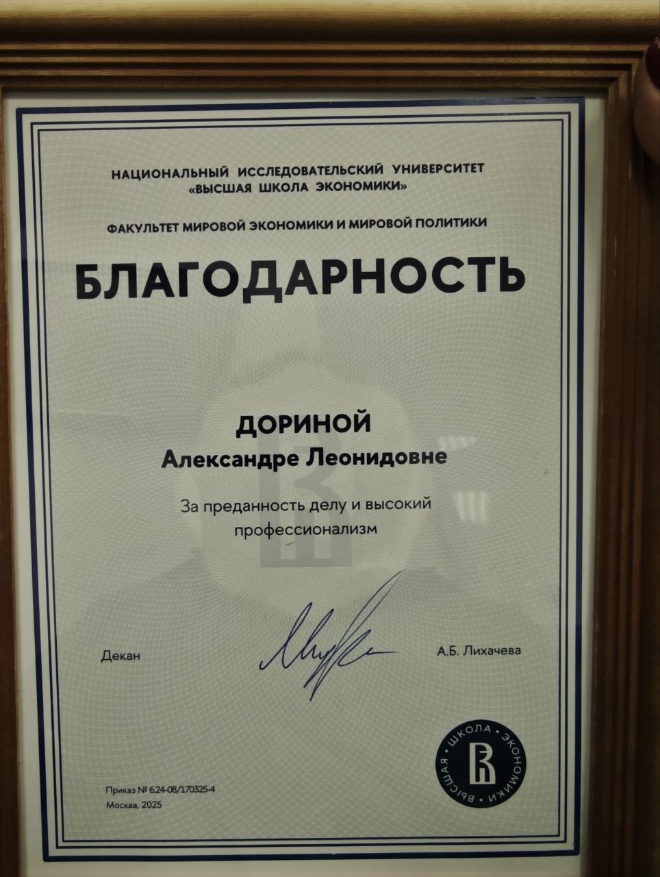 Александра Дорина, аналитик Лаборатории экономики изменения климата, удостоена медали "Признание — 25 лет успешной работы". Награда вручается сотрудникам университета за вклад в его развитие. Также Александра получила благодарность декана факультета мировой экономики и мировой политики за преданность и высокий профессионализм.